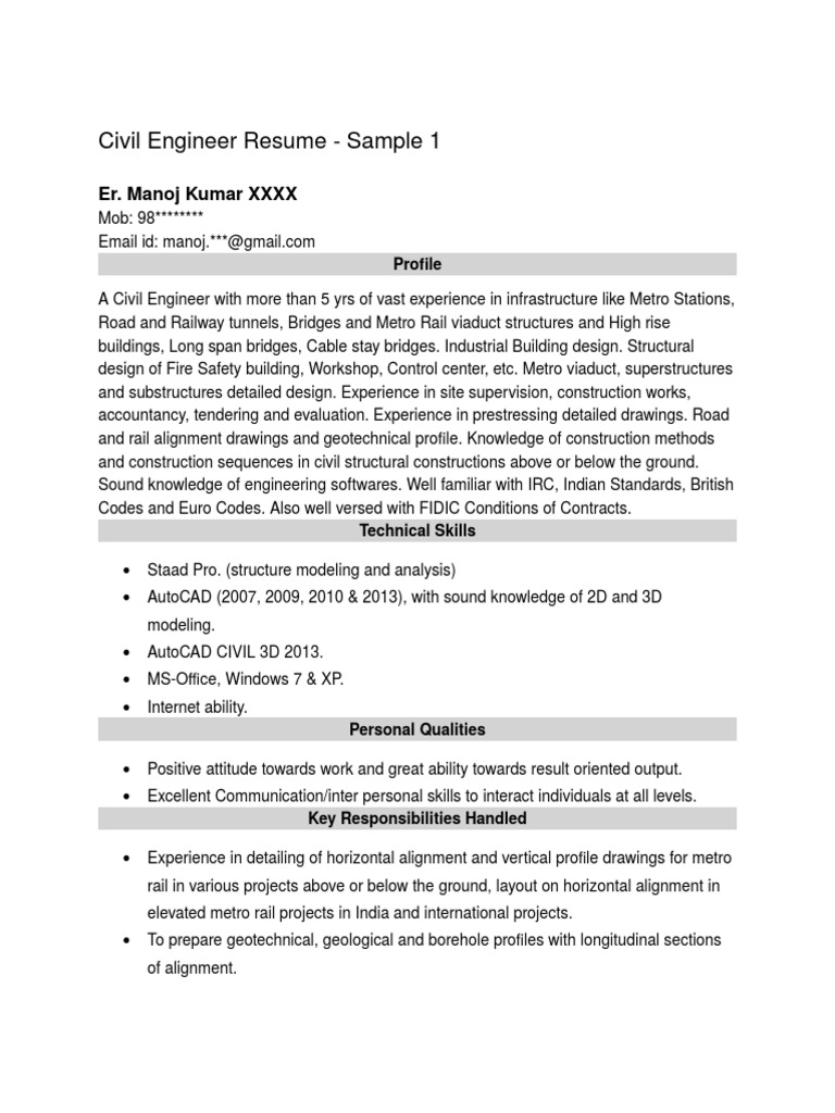 A resume objective shows passion when you lack experience. A professional summary is the best option for a senior quality assurance engineer resume with at least 2 years of experience. Guide the recruiter to the conclusion that you are the best candidate for the graduate civil engineer job. Civil engineers must demonstrate competence in a variety of capacities, and the summary statement section of your resume gives you the chance to do so in an organized way. When you are ready to send your resume to employers, it's important to be aware of the current market conditions for civil engineers. You can get a good idea of what you should include by reviewing the civil engineer cv example. In this article, we will talk about how you can write a winning resume title for civil engineering students and invite the recruiter to look at the rest of your profile with more interest. Profile summary an innovative and resourceful fresher having a bachelor of engineering degree in civil engineering stream. Salary can vary based on factors such as location, company, and industry. Bachelors in civil engineering with nearly 7 years of experience in planning & implementing technical solutions for designing, planning and constructing highways, tunnels and bridges currently associated with abc constructions, mumbai as project manager; If you are a career changer or have many years of experience, craft a powerful summary to highlight your accomplishments and skills. Select engineering related action words As you create your civil engineer cv, keep these tips in mind:
